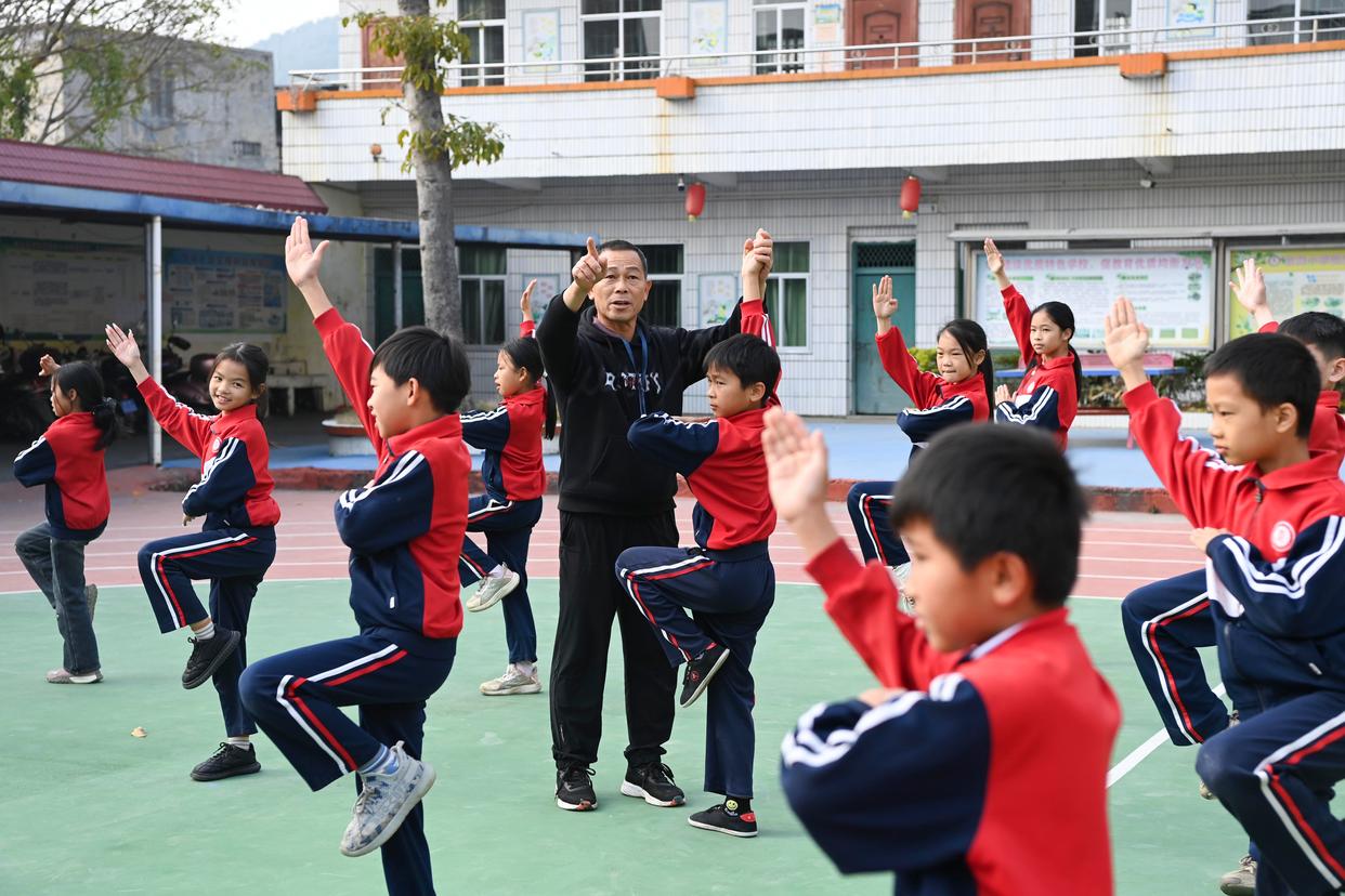 在兴业县石南镇东周小学,武术教练倪济秋在纠正学生的动作