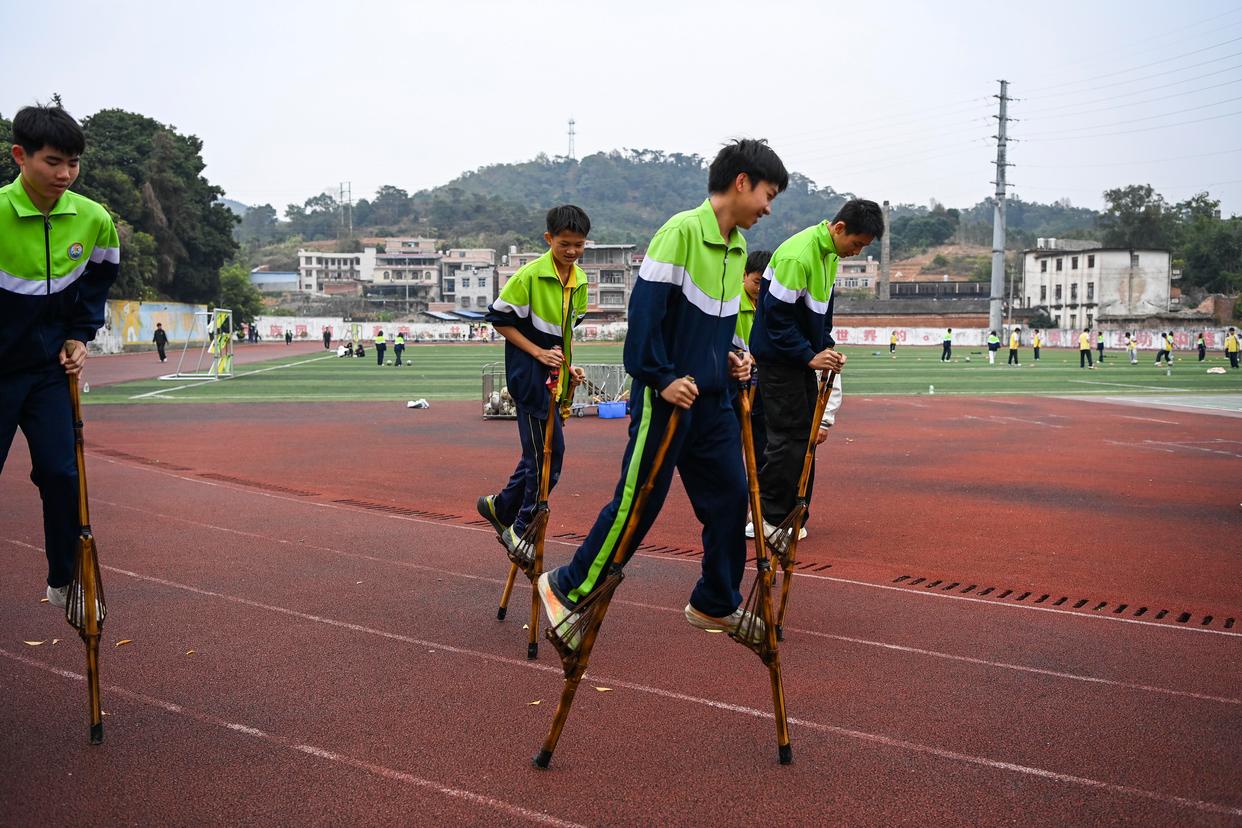 玉林市民族中学学生在练习传统民族体育项目高脚马