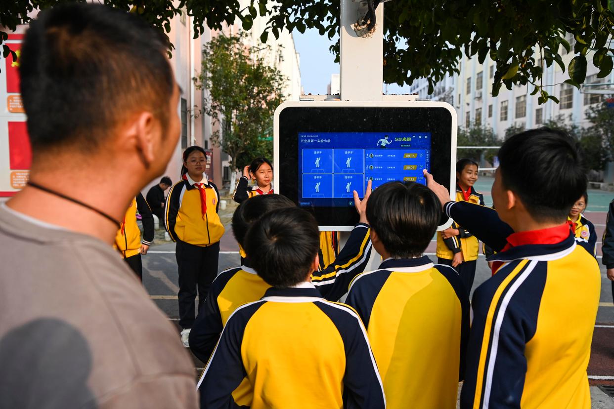 在兴业县第一实验小学,学生们利用AI体育设备进行跳绳练习